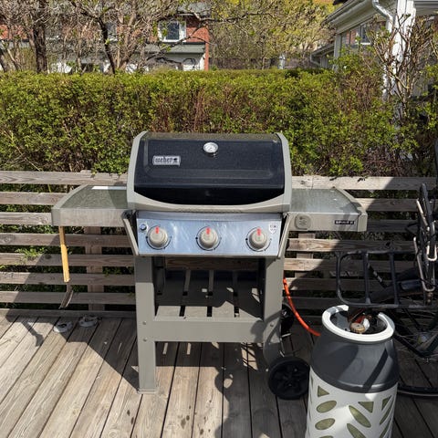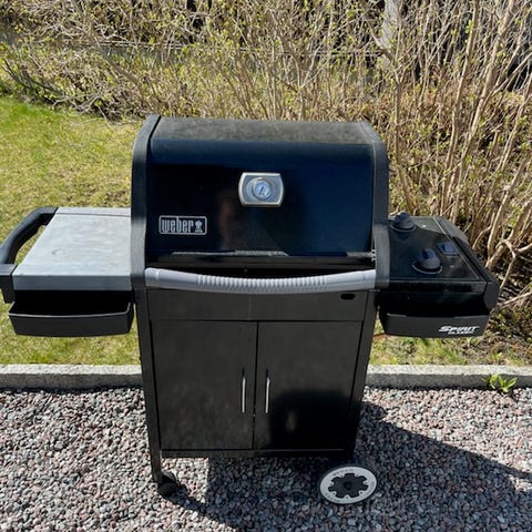 Weber Spirit II GS4 gasolgrill med tre brännare och gjutjärnsgaller. Har termometer i locket, sidobord och hylla under för gasolflaskan. Nyfylld gasoltub ingår ! Nytt överdragsskydd ! Säljes pga flytt!