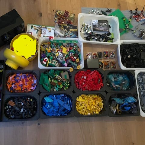 Stor låda med blandade LEGO-klossar i många färger och former. Flera mindre påsar med sorterade bitar och några äldre byggbeskrivningar följer med i lådan. ca 10kg . hämtas hos säljaren