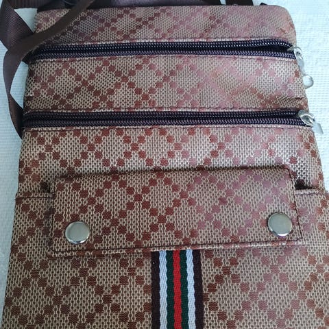 Crossbag handväska. Nyskick! Handtag och justerbar axelrem. Fickor inuti. Ficka med blixtlås utanpå framtill och på sidorna. Höjd ca 25 cm, bredd ca 30 cm. Kan mötas upp i Stockholm city.