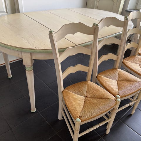 Superfint handsnickrat klaffbord med små lådor på sidorna för ljus och servetter. Vitmålat. Väldigt snygga ben. Litet när det är ihopfällt och stort när det är utfällt. Utfällsskivorna är 66cm så bordet blir ca 173cm långt helt utfällt. Hämtas i Vasastan hos mig, jag kan hjälpa till att bära .