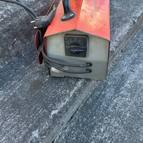 Svetstransformator med handtag ovanpå, kablar med klämmor. Svetshjälm, originalkartong och div. elektroder.