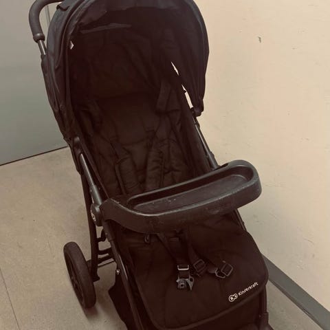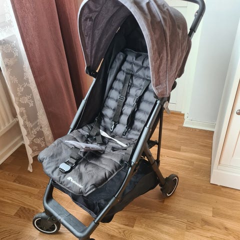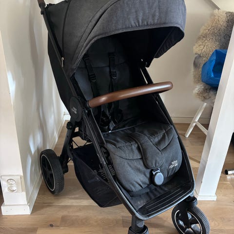 Britax sulkyvagn i grått tyg med svart chassi. Har fempunktssele, varukorg under och svängbart framhjul.