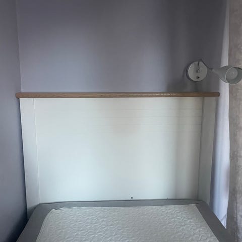 Vintage sänggavel i ljust trä med rottingdetaljer i ett bågformat mönster.