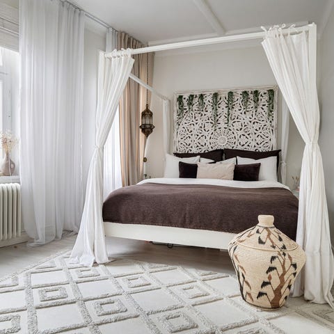 Himmelssäng i trä med brunröd finish ommålad) Sängen har fyra stolpar och en ram för tyg eller sänghimmel. Passar som dubbelsäng i sovrum och ger möjlighet att hänga gardiner eller tyg runt sängen för avskärmning eller dekor. Madrass och textilier ingår.