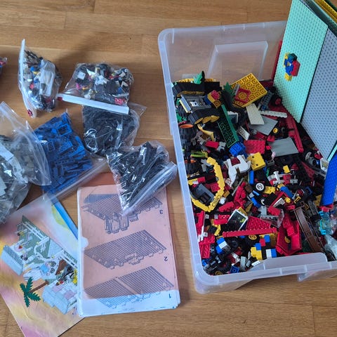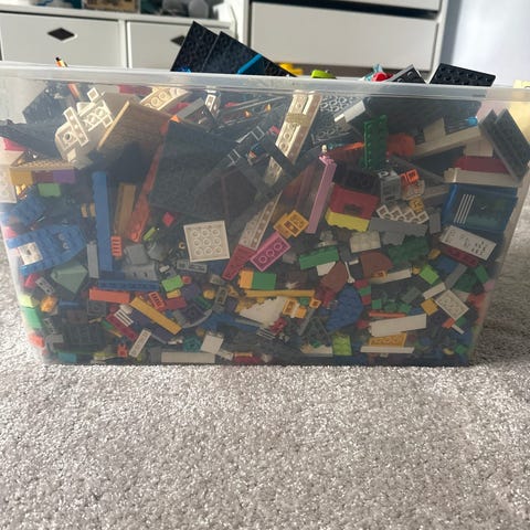 1,5 kg LEGO blandade klossar i lila LEGO-förvaringslåda. Flera olika typer av bitar i olika färger och former.