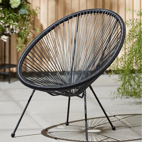 Två grå loungestolar för uteplats eller altan med rund sits i snördesign. Står på svarta metallben och är lätta att flytta runt på däcket. Väldigt bekväma och loungeiga 😎☀️