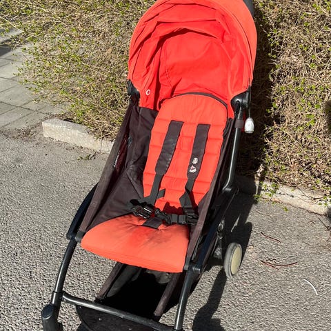 BABYZEN YOYO sulky i rosa med svart chassi. Har sele i sittdelen, varukorg under och justerbart sufflett.