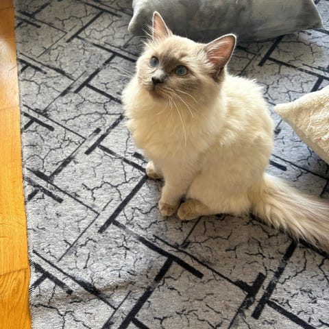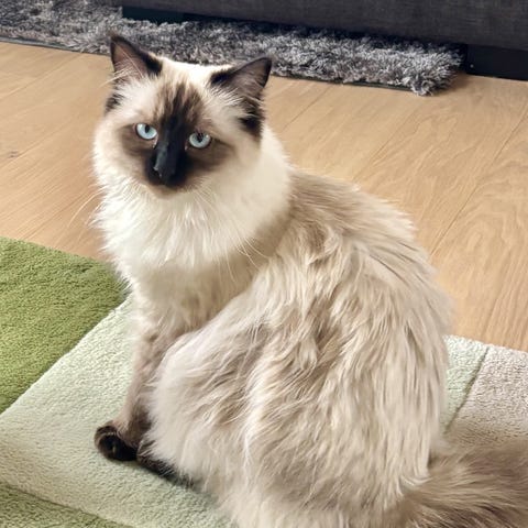 Katten är en mix av Ragdoll och Siames. Född 2025-10-29.