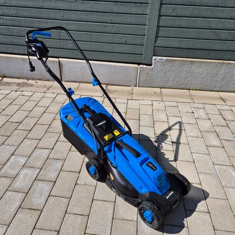 Batteridriven gräsklippare från Biltema med uppsamlare bak. Lätt att köra tack vare sin låga vikt. Funkar kanon och gör jobbet. Klarar utan problem vår villatomt på en laddning. Uppsamlare är lite sliten men funkar trots det som den ska.