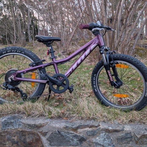 Lila cykel från Scott, modell Contessa. 24 tum. 21 växlar. Cykeln är väl använd och det finns en del skav i lacken.
