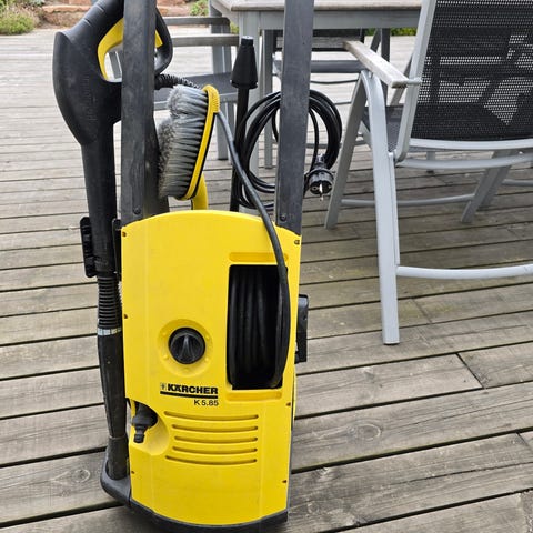 Kärcher högtryckstvätt i gul färg med bärhandtag upptill. Med sprutpistol och lång slang som är smidig att dra runt på gården.