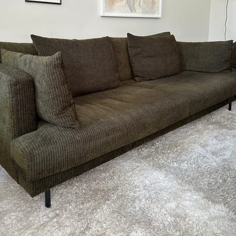 Soffa med vinklad form. Mörkt gråmelerad klädsel, dunplymåer, extra kudde samt nackstödskudde, s.k. pöl.