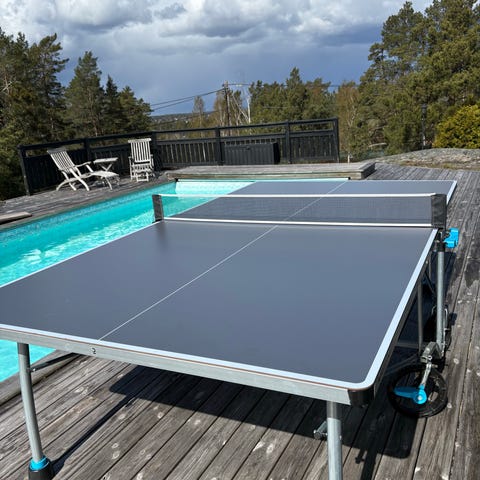 Smidigt mini pingisbord med nät, står på hopfällbara ben i metall. Grå skiva med vit kantlinje och mittlinje, lätt att ställa undan när det inte används.