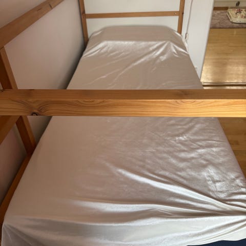 Övre bädden 90x200 cm bäddmått, extrasängens bäddmått är 75x190 cm.