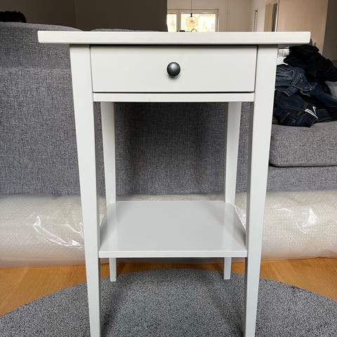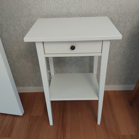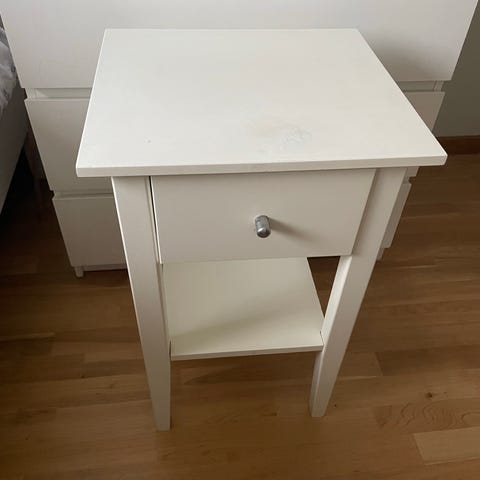 Klassiskt vitt sängbord med en låda och silverknopp!