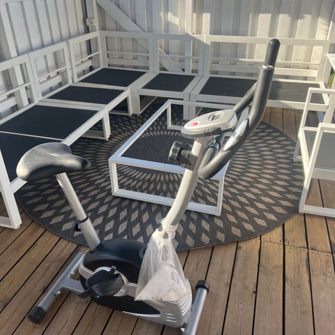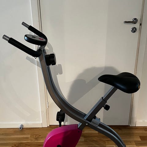 Motionscykel med digitalt display som visar tid, hastighet, distans, puls och kalorier. Justerbart säte och pedaler med rem, samt handtag framtill för bra stöd vid träning hemma.