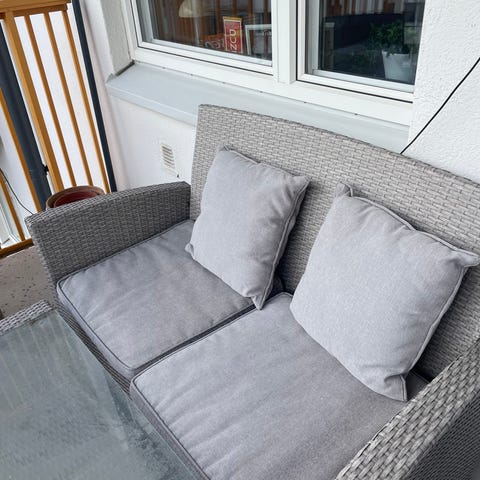 Utemöbler bestående av fyra fåtöljer och två glas bord sparsamt använda. Färgen på dynorna naturfärgad dem tjocka och bekväma