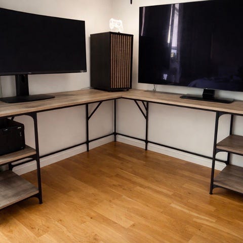 Skrivbordet är hörnformat och perfekt storlek för en person som vill få plats med elektronik eller dylikt.