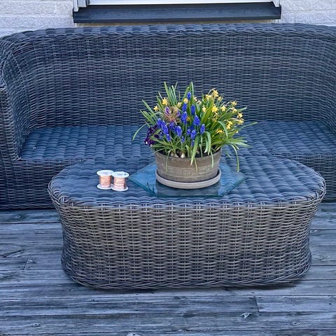 Säljer ett stilrent set med utemöbler: 4 bekväma fåtöljer och ett bord. Perfekt för altan, balkong eller trädgård.