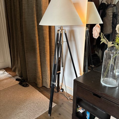 Säljer en snygg och stabil golvlampa i tripod-design som ger ett varmt och behagligt ljus. Lampskärm och glödlampa ingår.