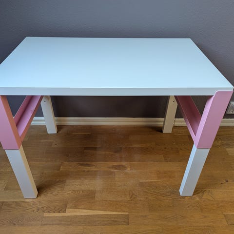 Säljer ett mycket trevligt bord som vi använt som barnskrivbord. Stolarna säljes separat. Bordet har vackra detaljer. Mått: 51cm x84 cm. Höjd 64 cm. Lite slitage på ovansidan men går att sandpappra ner om man vill. Det är inte IKEA.