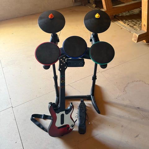 Två stycken trådade PS2 kontroller som medföljde en bundle för Guitar Hero I och II.