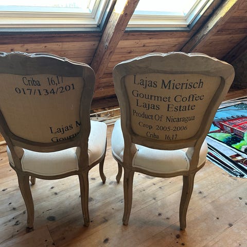 Den ena stolen har ett dekorativt tyg med text på ryggen som ger en rustik känsla.