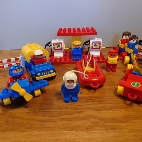 Äkta LEGO Duplo. Bondgård med traktor, hage och djur. Postbutik med utkörningsbil, bord, stolar och mamma med barnvagn och baby. Greta Gris med familj. Bilar, gubbar, plattor med hjul och massa byggklossar i olika storlekar och färger. Medföljer en fin förvaringslåda.