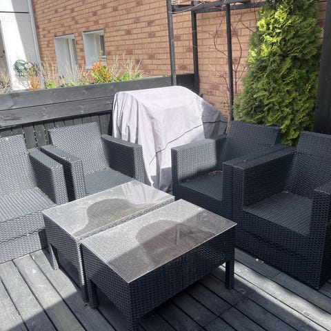 Snyggt set med utemöbler i mörk rotting med soffa, fåtöljer och bord. Vita dynor ingår!