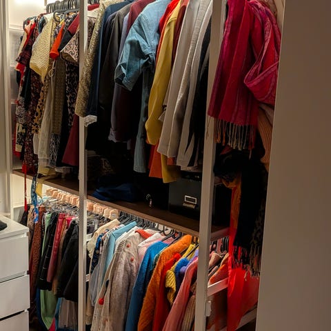 Långt hyllsystem med hyllplan och klädstänger.