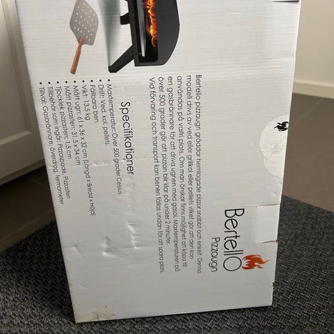 Pizzaugn från Austin Barbeque i rostfritt stål med skorsten och ben som fälls ut på bordet. Har sten i botten och öppning fram som passar bra för pizzaspade. Använd 3 gånger. Säcken med pellets medföljer. 👍
