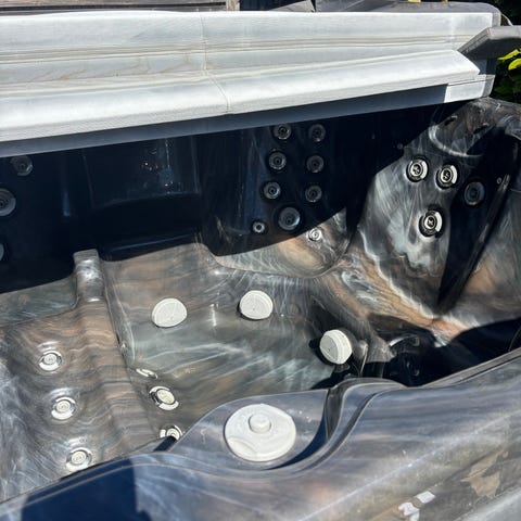 Stort spabad med lock och grå utsida. Svart insida. Medföljande trappa gör det enkelt att kliva i och ur badet.