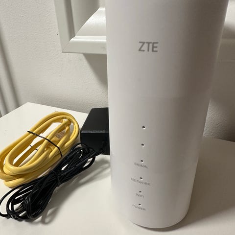 ZTE MC888 Pro router med WiFi 6, vit modell som står upp och har knappar och lampor på framsidan. På baksidan finns nätverksport och strömanslutning, info om modell och nätverk sitter undertill.