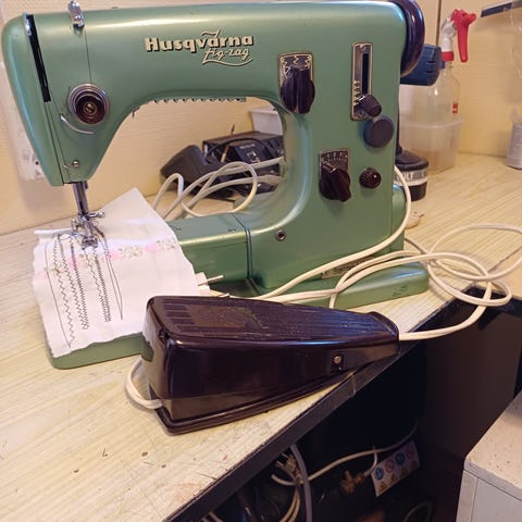 Symaskin med grön/vit front och digital panel med olika sömval. Har knappar för inställningar och arbetsyta med belysning under nålen.
