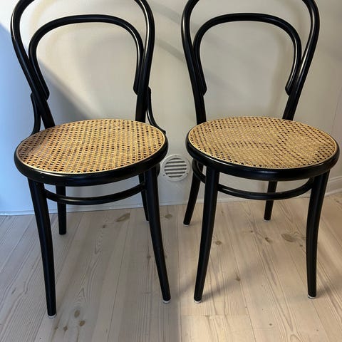 Säljer två st TON No.14 stolar i nyskick, vita med rottingsits (klassisk Thonet design) pga flytt. Finns i Vasastan i Sthlm