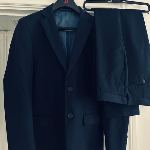 Marinblå kostym i Slimfit modell från Dressman, kavaj st. 48 lång, byxa stl. 32-32.