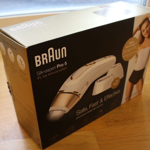 Braun IPL hårborttagningsapparat i vitt med roséguld-detaljer. Har flera ljusnivåer och används med sladd och nätadapter.