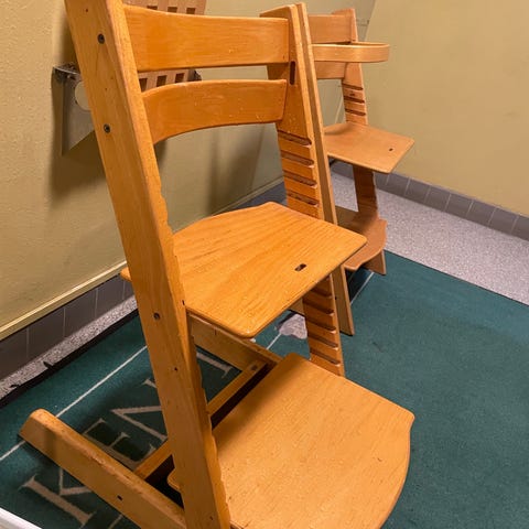 Gammal stol i trä man kan vika ut och barnet kan leka eller uppfällt sitta vid matbord tex.