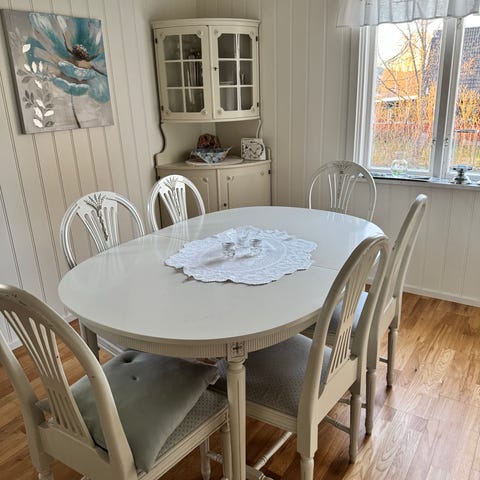 Fin mat grupp med runt bord 150cm i diameter och sex klädda stolar i grått tyg. Lite spår av användning på skivan i övrigt i fint skick.