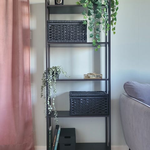 Svart bokhylla i träfaner säljes. Svart baksida kan enkelt tas bort.