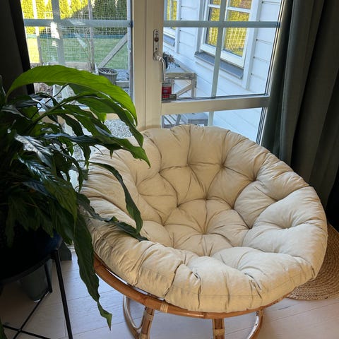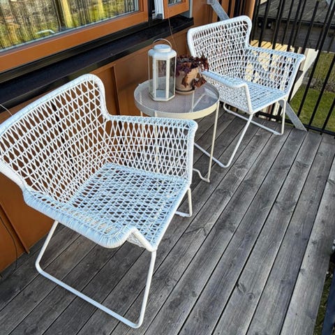 Avtagbara dynor medföljer. Fåtöljerna är egentligen avsedda för utomhusbruk, men har endast använts inomhus.
