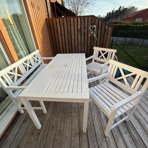Vit trädgårdsbänk i trä med ribbad sits och ryggstöd med kryssmönster. Stabil bänk som står på fyra ben och har armstöd på båda sidor.