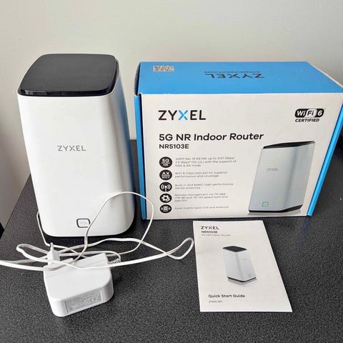 Zyxel NR5103E 5G NR indoor router säljes. Vit router med svart ovansida och nätadapter samt nätverkskabel synliga på bilden.