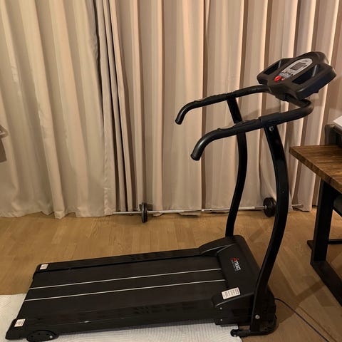 Gå/löpband med digital display för hastighet, tid och distans. Har säkerhetslina, mugghållare och kan fällas ner för att ta mindre plats.