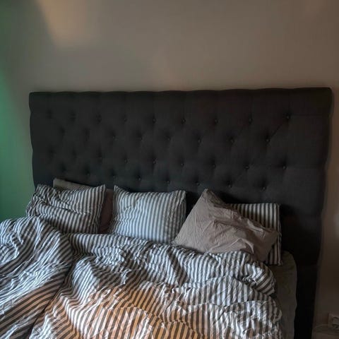 Sänggavel från Jotex i mörkblå tyg med knappar längs hela framsidan. Mjuk stoppning som gör den skön att luta sig mot.