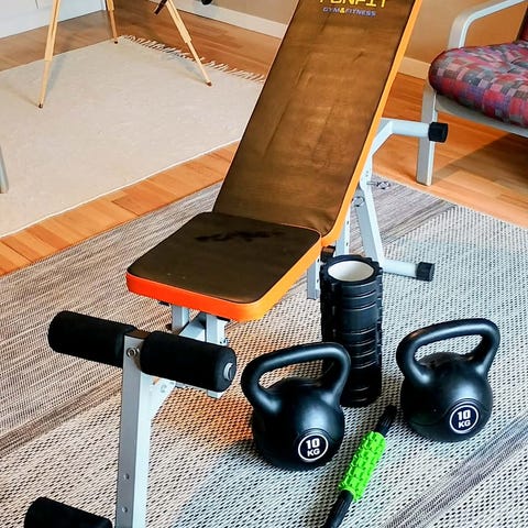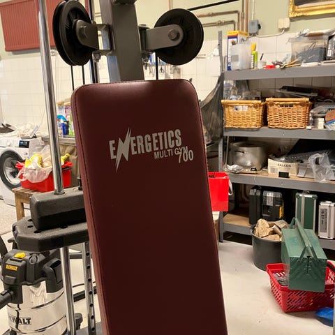 Klarfit träningsbänk med skivstång och flera viktskivor i olika storlekar. Justerbar bänk med benstöd och armstöd, samt curlstång och snabblås som syns på bilderna.