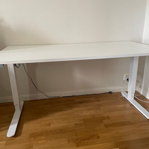 Vitt skrivbord från IKEA. Stadiga ben och gott om plats för skärm och datortillbehör i kombination med arbetsyta. Det finns också ett nät under bordet, för att hålla kablarna på plats och gömda. 140 cm brett, 60 cm djupt, 74 cm högt.