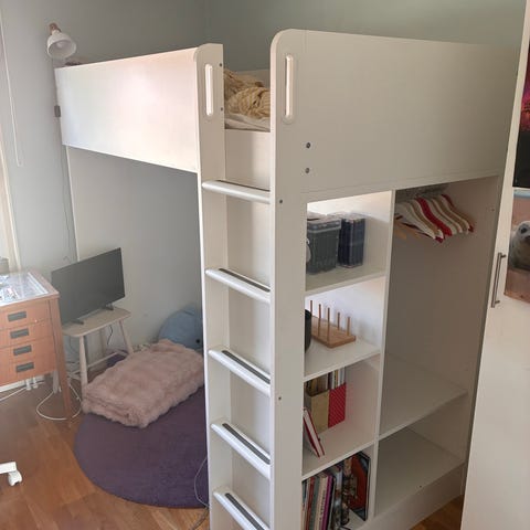 Vit loftsäng från IKEA med skrivbord och lådhurts under. Stege upp till sängen, öppna hyllor på sidan och ett skåp med dörr för extra förvaring.