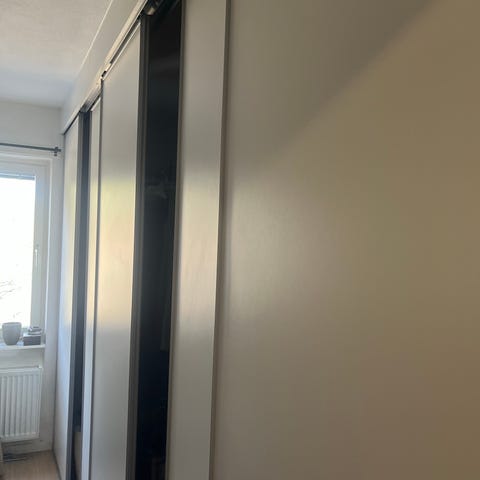 Två vita skjutdörrar 72 breda och 205 höga med enkla, släta speglar.