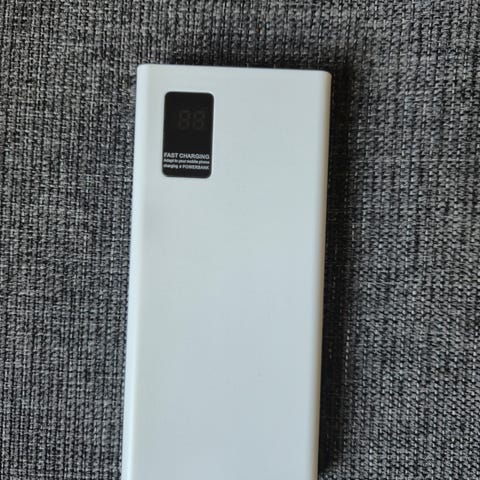 Powerbank med en kapacitet på 10000 mAh. Den har en ingång på 5V-2.0A och en utgång på 5V-2.1A.